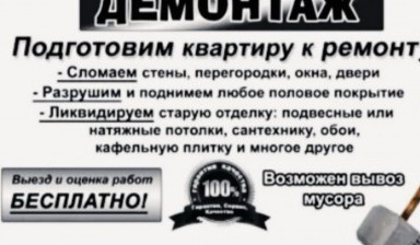 Выполним демонтажные работы в квартире, офисе, коттедже, дачном участке. Слом перегородок, перепланировка, расширение проемов с усилением. Демонтаж окон, дверей, мебели. полов. плитки, линолеума, сантехники, ванны.