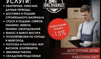 Услуги трезвых, опытных и пунктуальных грузчиков и разнорабочих, погрузка/разгрузка: - фур; - контейнеров; - вагонов; - грузовых машин; - разнорабочие; - работа на складе; - квартирные, офисные и дачные переезды; - сборка и разборка мебели; Услуги грузовых авто от 1,5 тонн. - Фургоны; - Бортовые грузовики; - Самосвалы; - Эвакуаторы; Вывоз мусора на свалку. Перевозки по городу и межгороду(Хабаровский и Приморский край) Низкие цены!!!